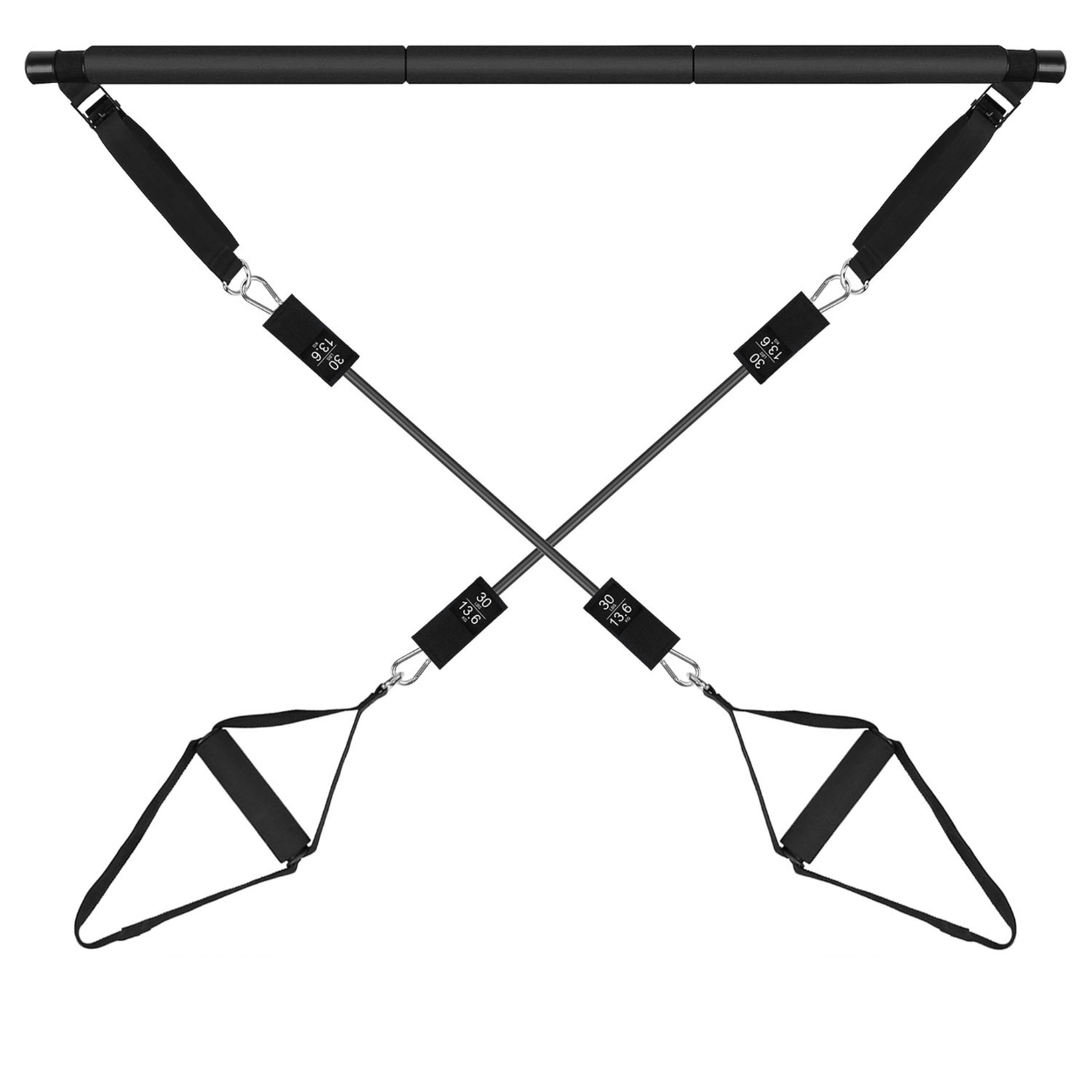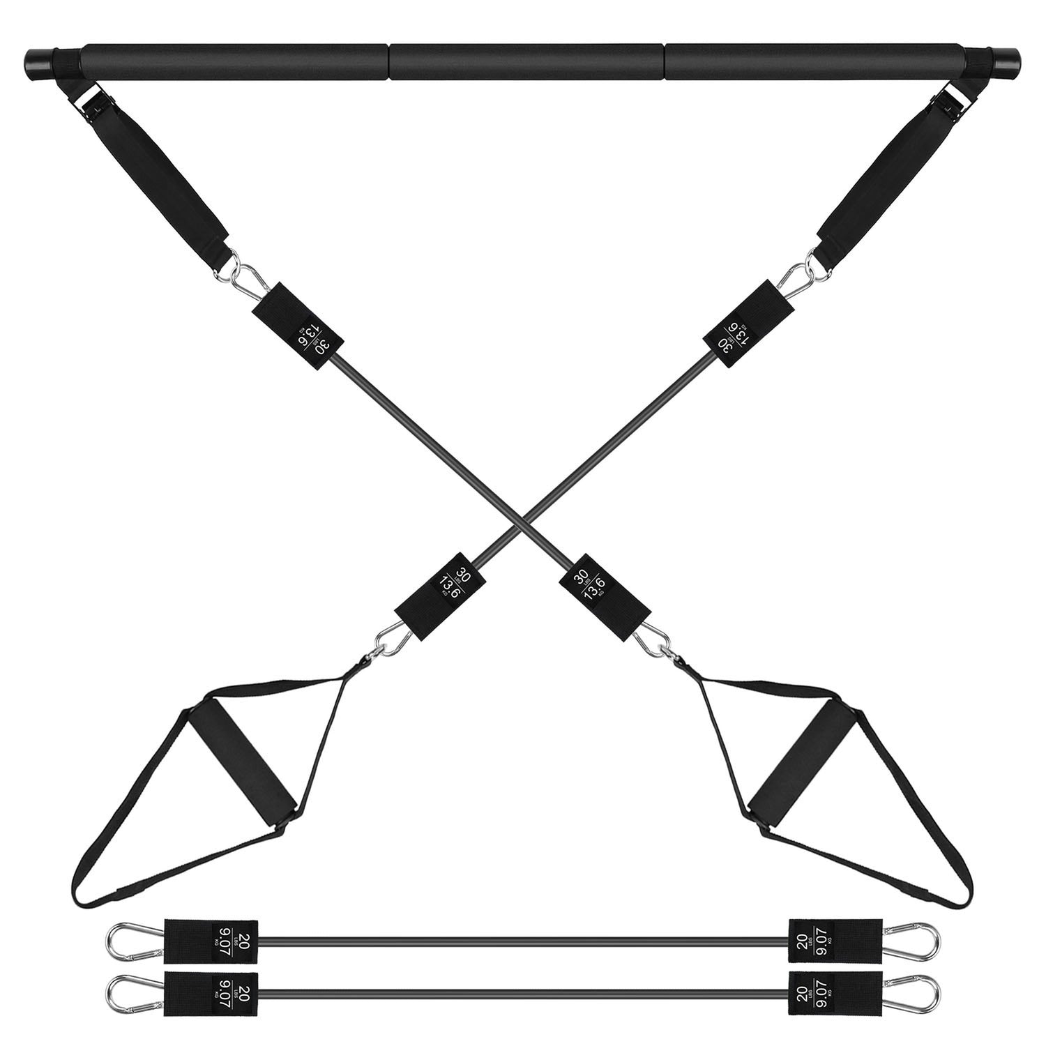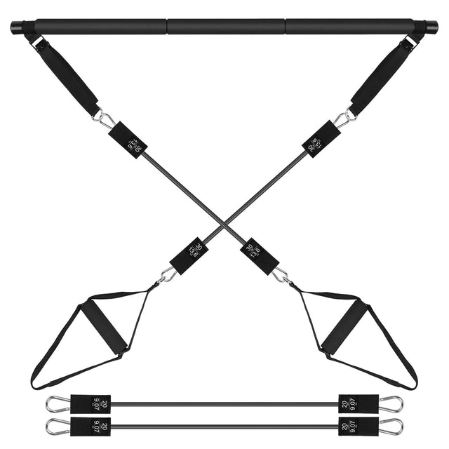 A portable Pilates bar kit designed for full-body shaping and muscle strengthening. Includes adjustable bands, padded straps, and a door anchor to support strength training, flexibility, toning, and posture improvement. Perfect for home, gym, office, hotel rooms, or outdoor training.